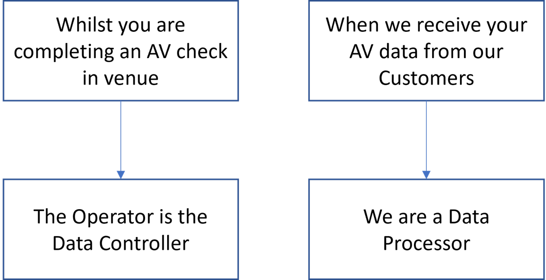 - Whilst our Customers are completing an AV Log, we act as a ‘Data Processor’ of personal data for our Customers. This means that we are acting on the instruction of our Customers to support them in the collection of your Personal Data to enable them to record their age verification checks in venue.