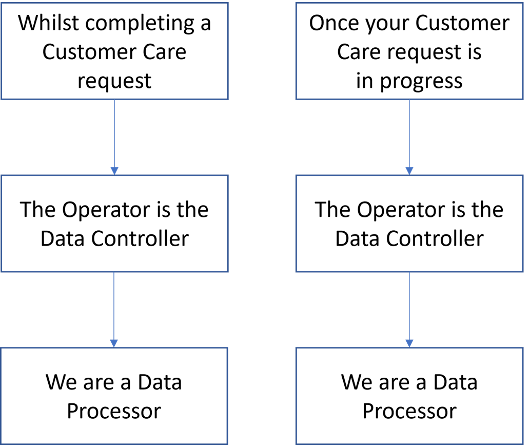 - Whilst you are completing your support request, we act as a ‘Data Processor’ of your data for our Customers. This means that we are acting on the instruction of our Customers to support them in the collection of your Personal Data to enable them to provide support services to you.