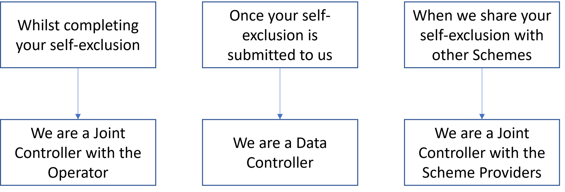 - If your Self-Exclusion requires us to share your exclusion data with Self-Exclusion Schemes operated by our Partners, we act as a ‘Joint Controller’ of your data with those Partners. This means we jointly determine with our Partners the purposes and means of processing your personal data, to enable us to provide the Self-Exclusion Service to you.